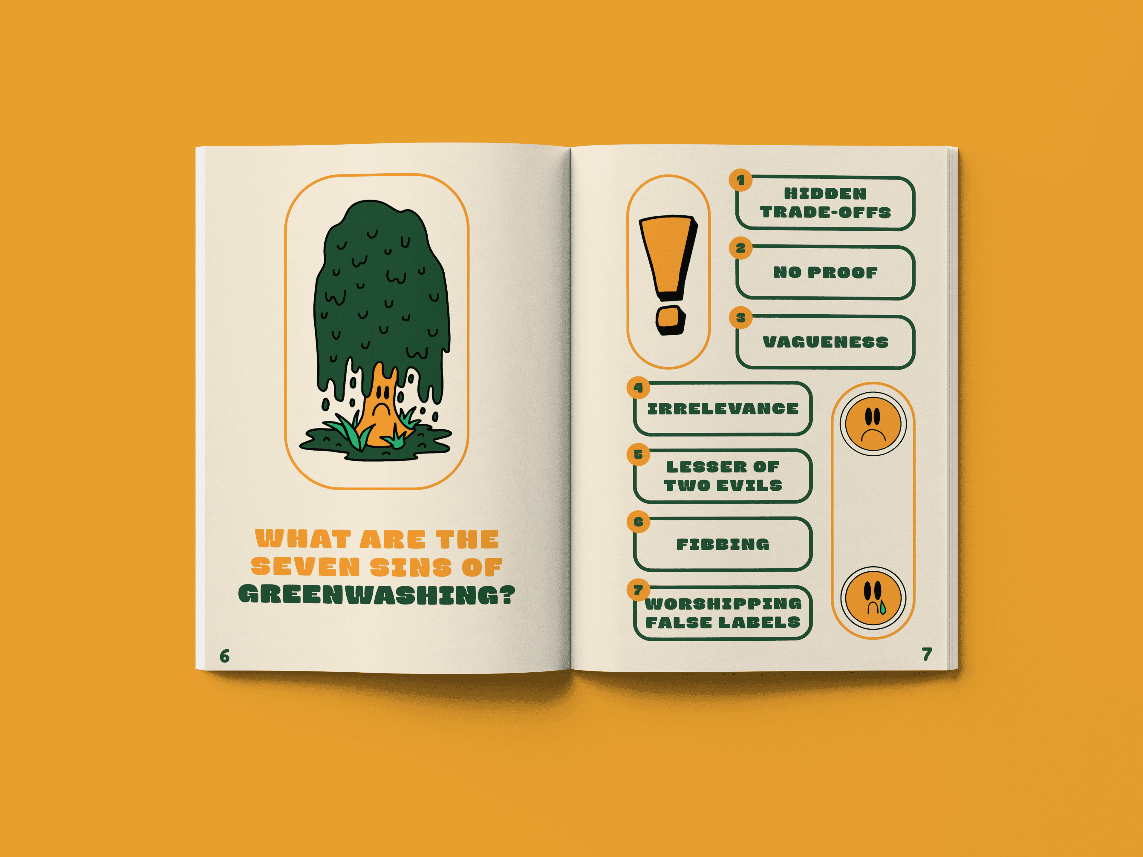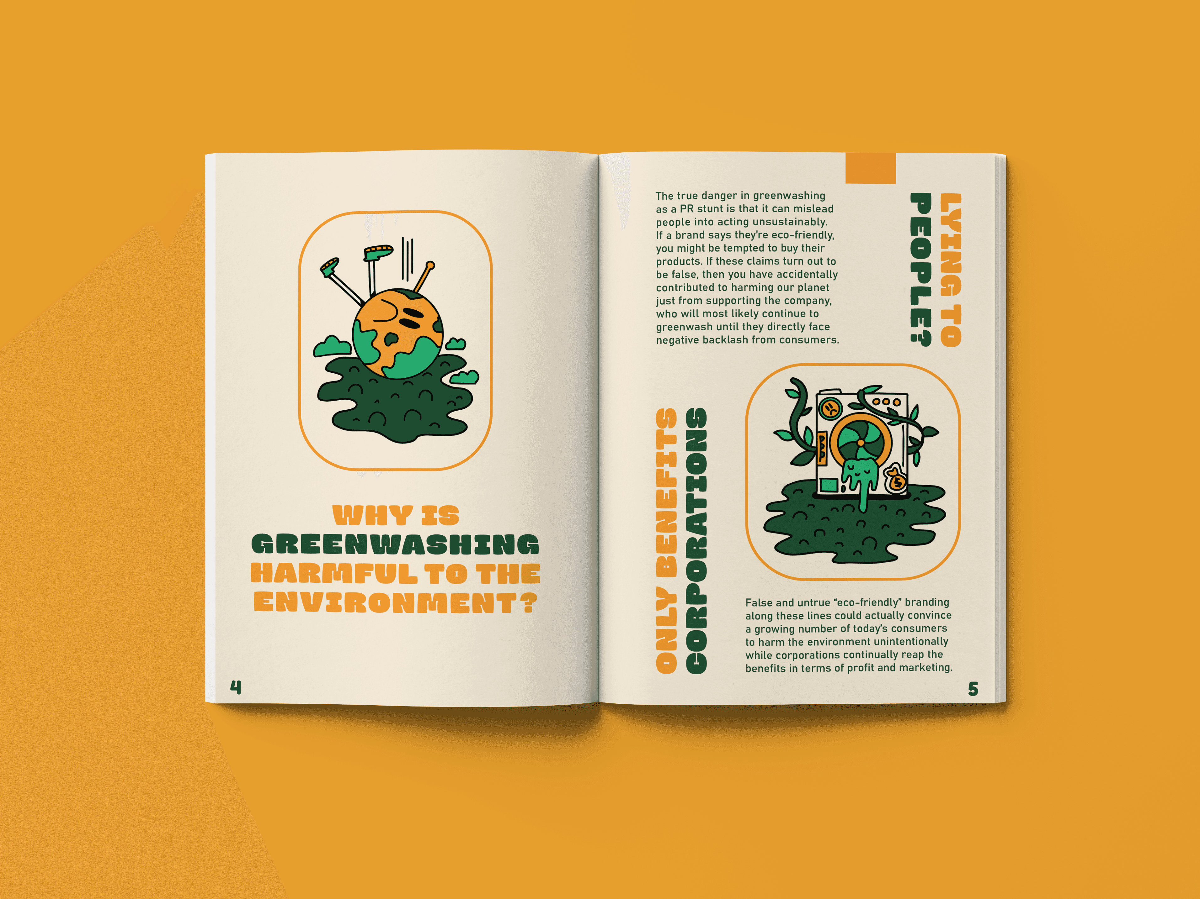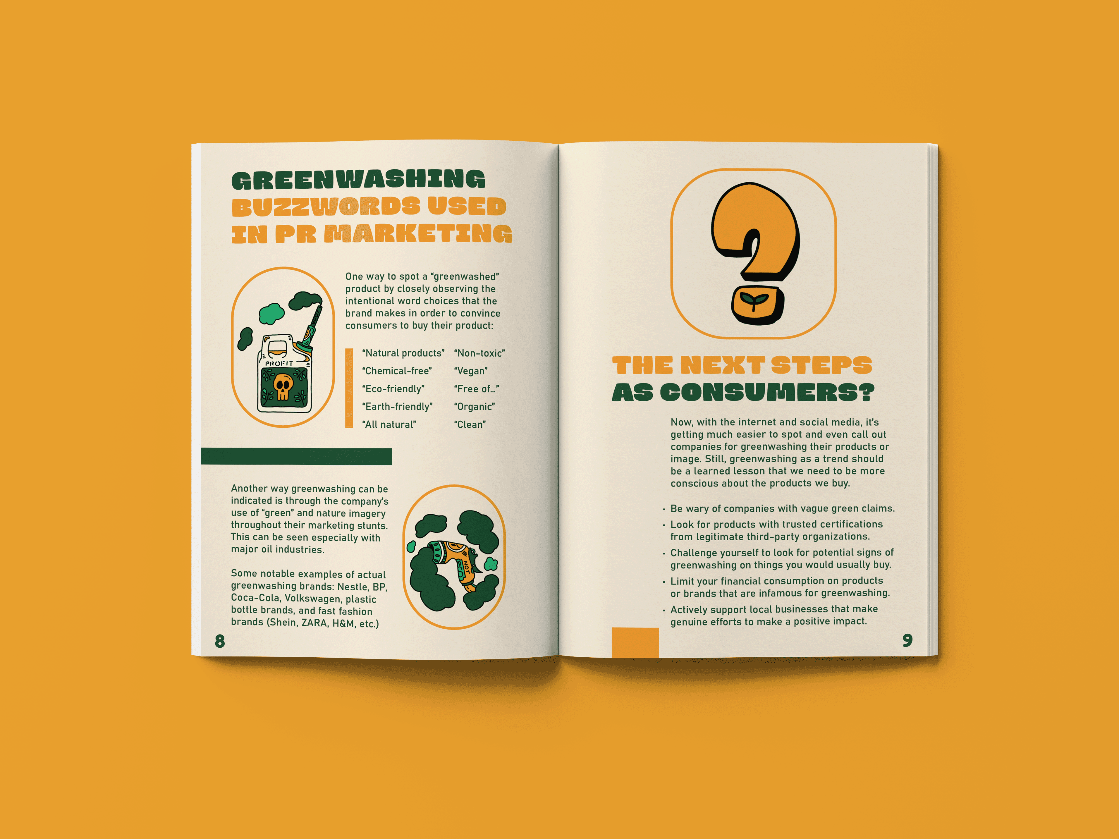 Greenwashing is one of the more insidious design problems of our moment. Companies have learned to speak the visual language of sustainability so fluently that consumers can no longer tell the difference between a genuine commitment and a marketing strategy. This project took that problem seriously, and then asked: what if the design that exposes it is just as compelling as the design that perpetuates it? Developed as an academic project, this editorial zine uses illustration, typography, and layout to make greenwashing legible to a general audience without dumbing it down. The visual language is deliberately disarming. Bold chunky type, warm amber and forest green, cheerful cartoon characters with hollow eyes and frowning faces. The tone is approachable, even playful, right up until it isn't. That tension is the point. Greenwashing works because it looks friendly. This zine fights it on the same terms. I handled both the editorial design and the illustration work, which meant every decision had to serve the same goal: make the reader feel comfortable enough to stay, and informed enough to leave differently than they arrived. The skull badge stamped with "100% Green Washing" is not subtle. Neither is a sad planet rendered in the exact visual language of a product that claims to love it. Good information design doesn't just present facts. It makes facts feel unavoidable. That was the brief I gave myself, and the one I kept coming back to with every spread.